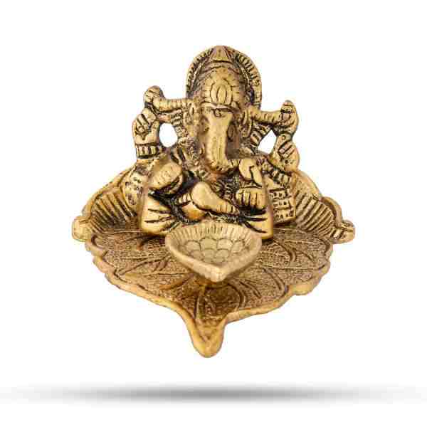 Leaf Ganesh Murti Deep - 3 x 3.5 Inches | Ganapati Vilakku/ Aluminium Statue/ Vinayagar Lamp for Pooja