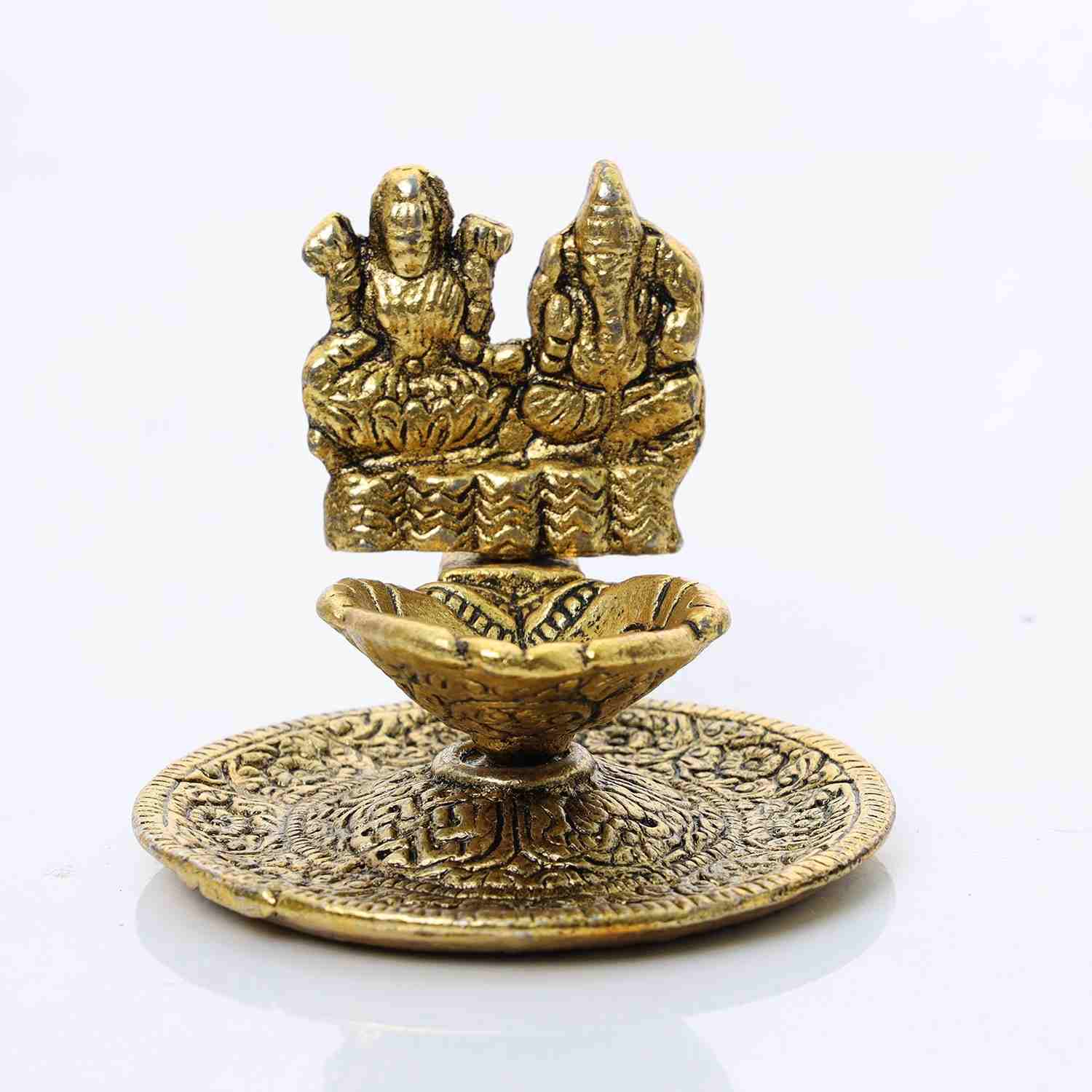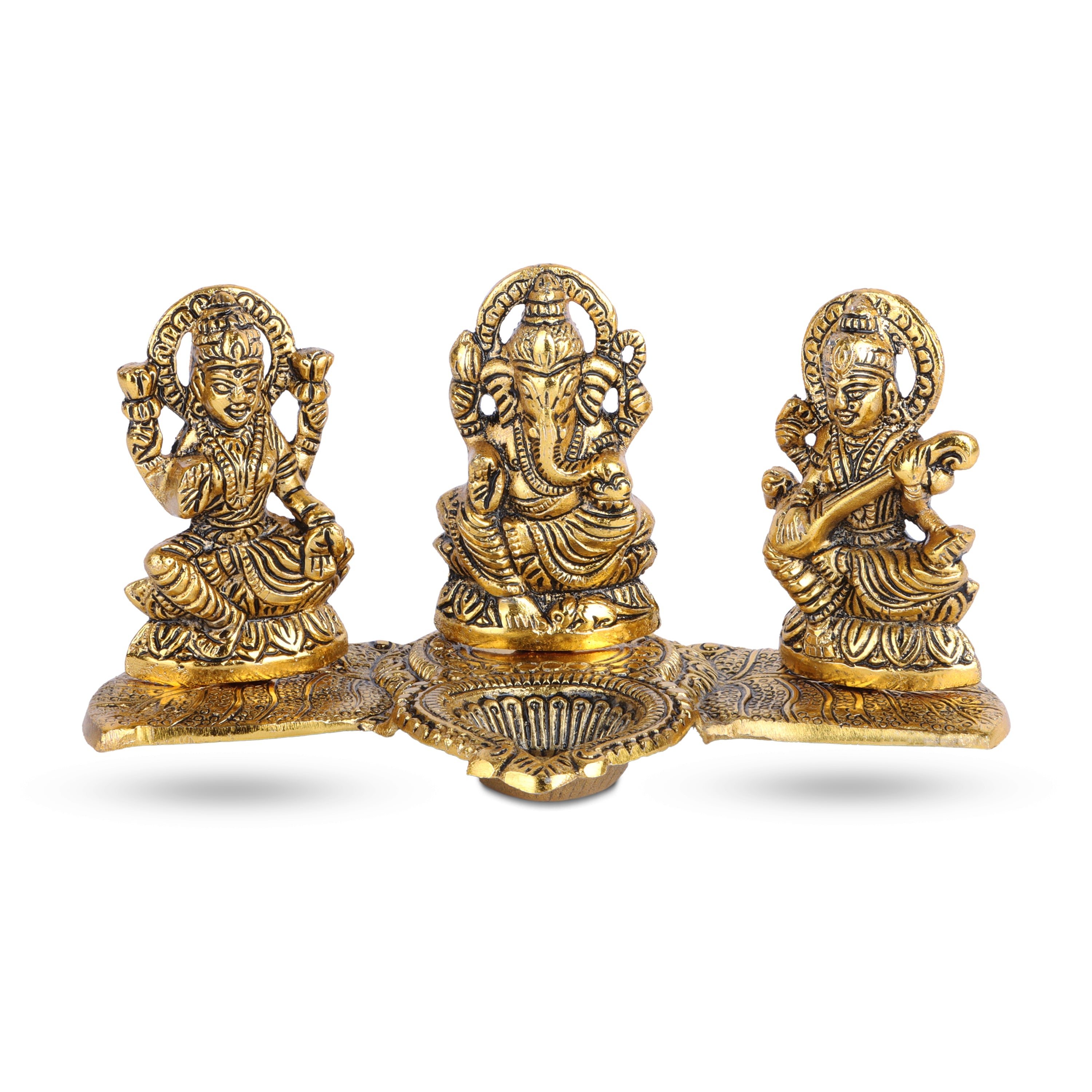 Lakshmi Ganesh Saraswati Sitting Diya - 5 x 8.5 Inches | Aluminium Deep/ Antique Polish Lamp for Pooja