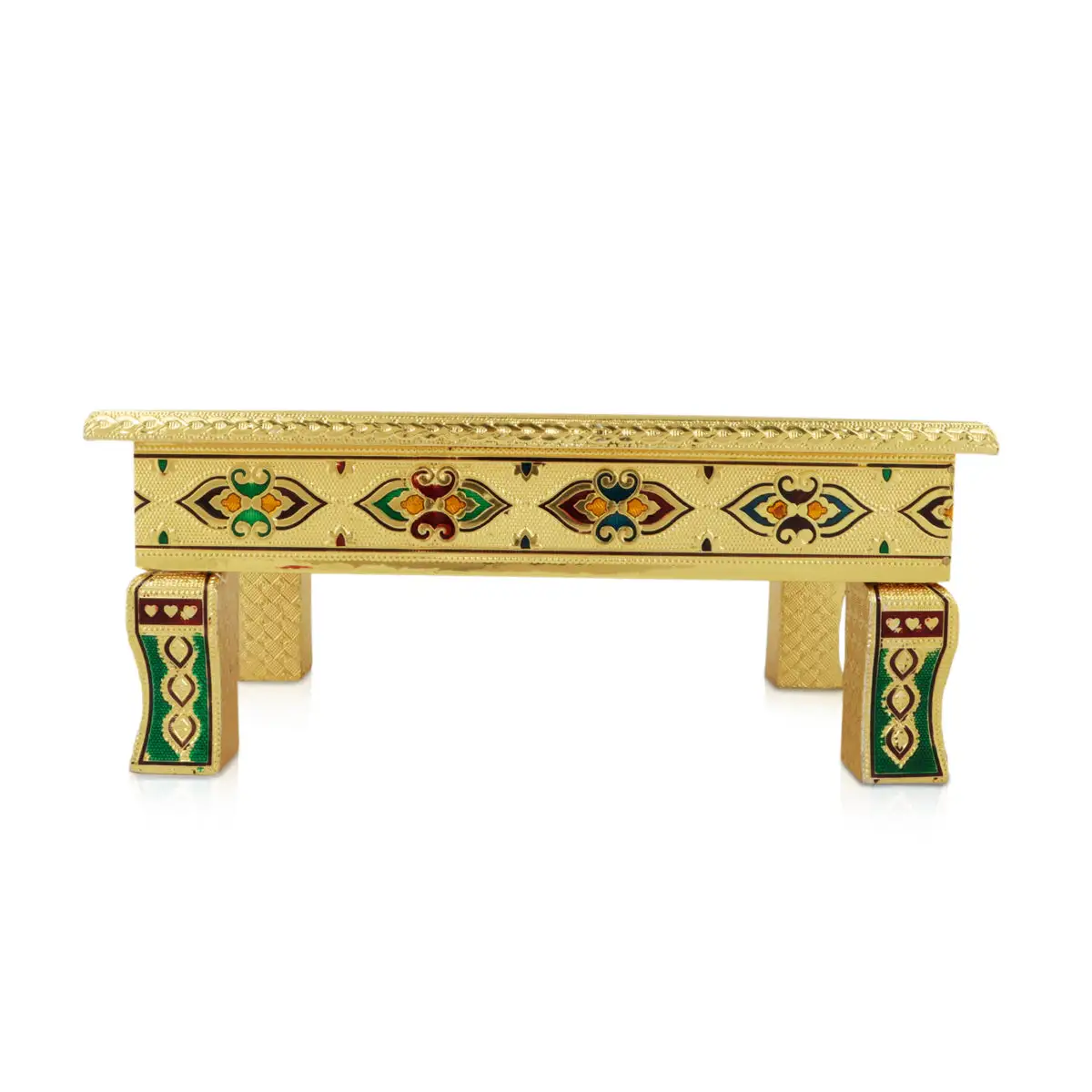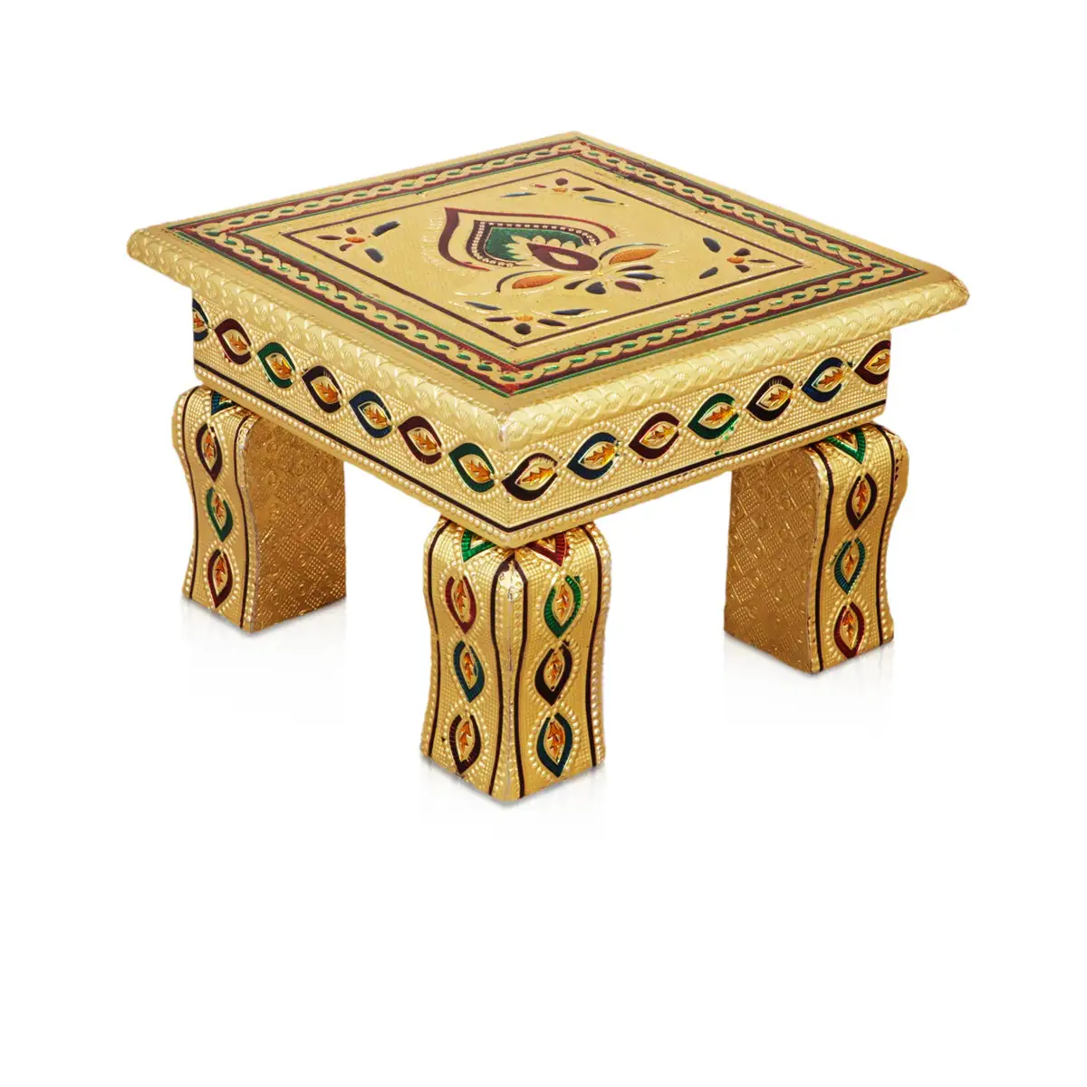 Bajot - 8 x 8 Inches | Wooden Manai/ Gold Polish Meenakari Design Chowki for Pooja