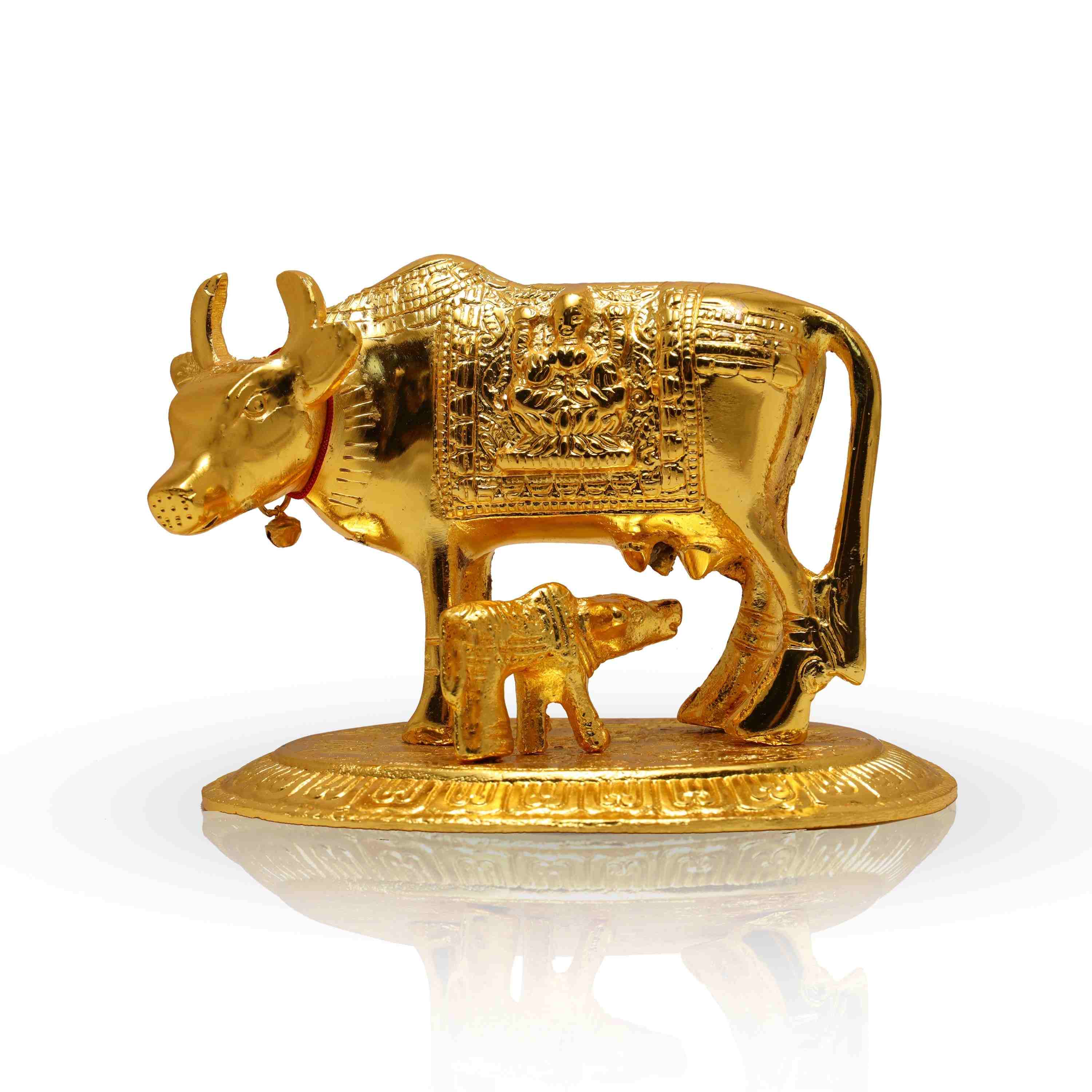 Kamadhenu Idol With Arch - 3.25 Inches | Brass Kamadhenu Statue/ Gold Polish Kamadhenu Cow Statue for Pooja