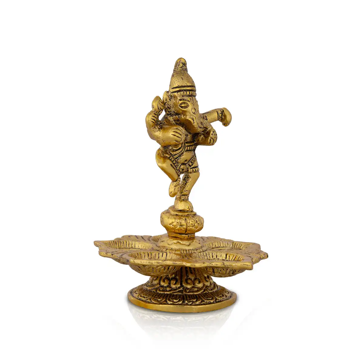 5 Face Deep With Dancing Ganesh - 5.5 x 4 Inches | Metal Vilakku/ Gold Polish Lamp With Base for Home