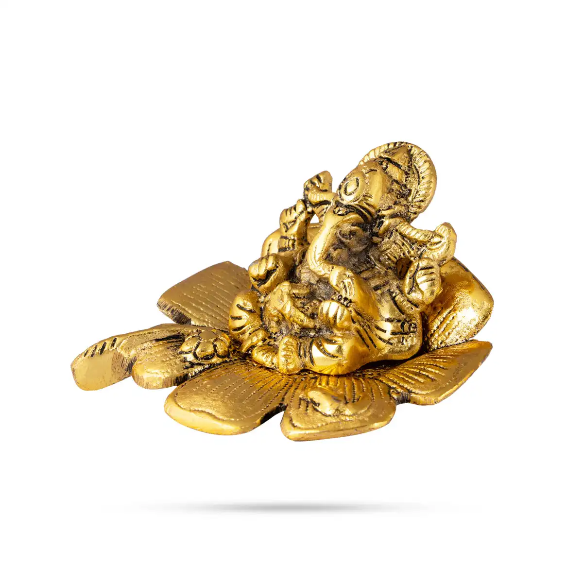 Ganesh Murti Sitting On Hibiscus Flower - 2.5 x 4.5 Inches | Aluminium & Gold Polish Ganpati Murti for Pooja