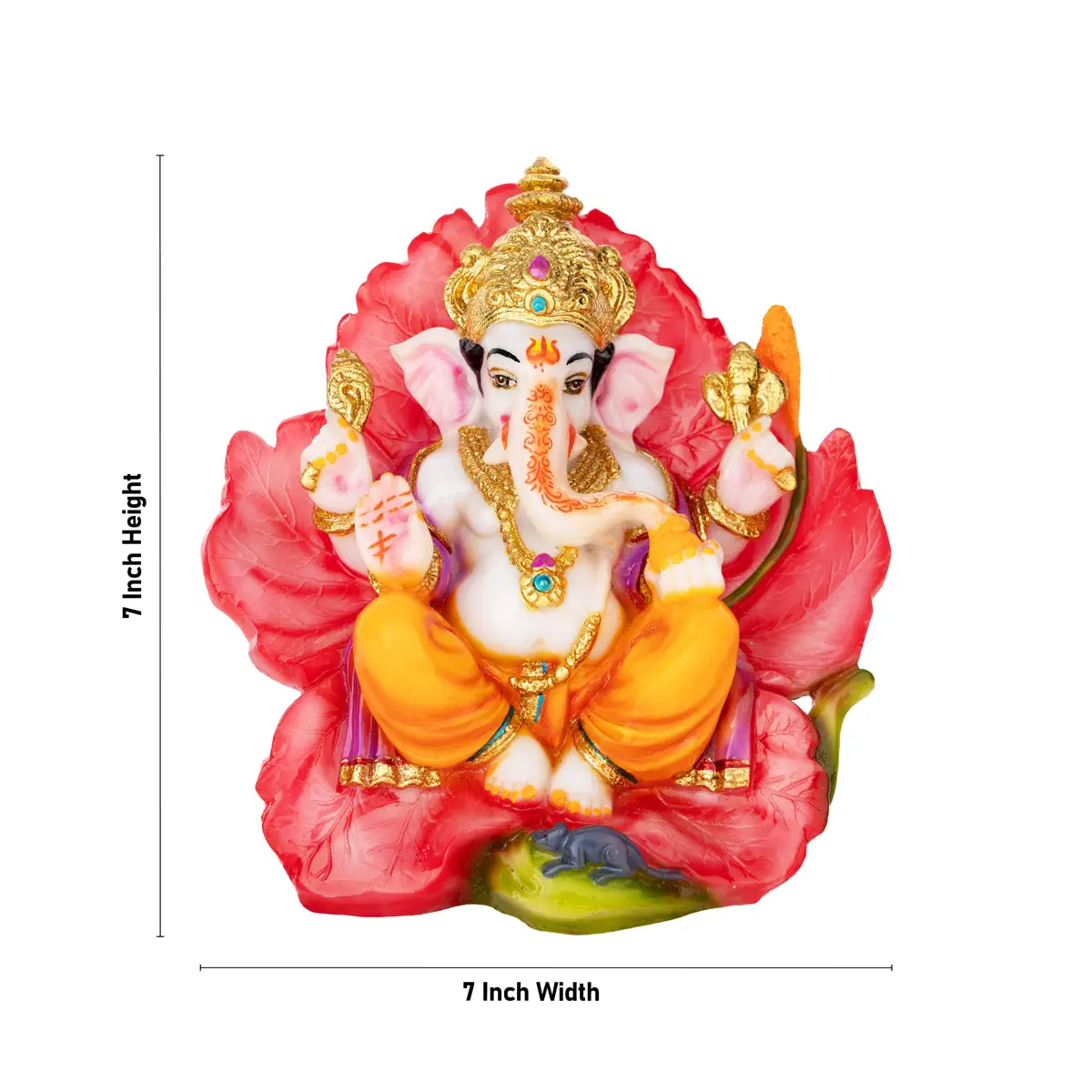Ganesh Murti Sitting On Hibiscus Flower - 7 x 7 Inches | Marble Dust Murti/ Painted Vinayaka Statue for Pooja