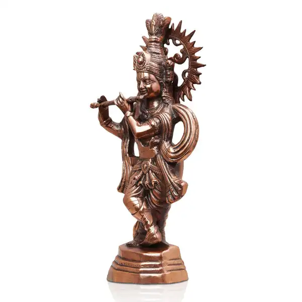 Krishna Murti Standing On Base - 22 x 11 Inches | Copper Oxidised Standing Krishna Idol for Pooja