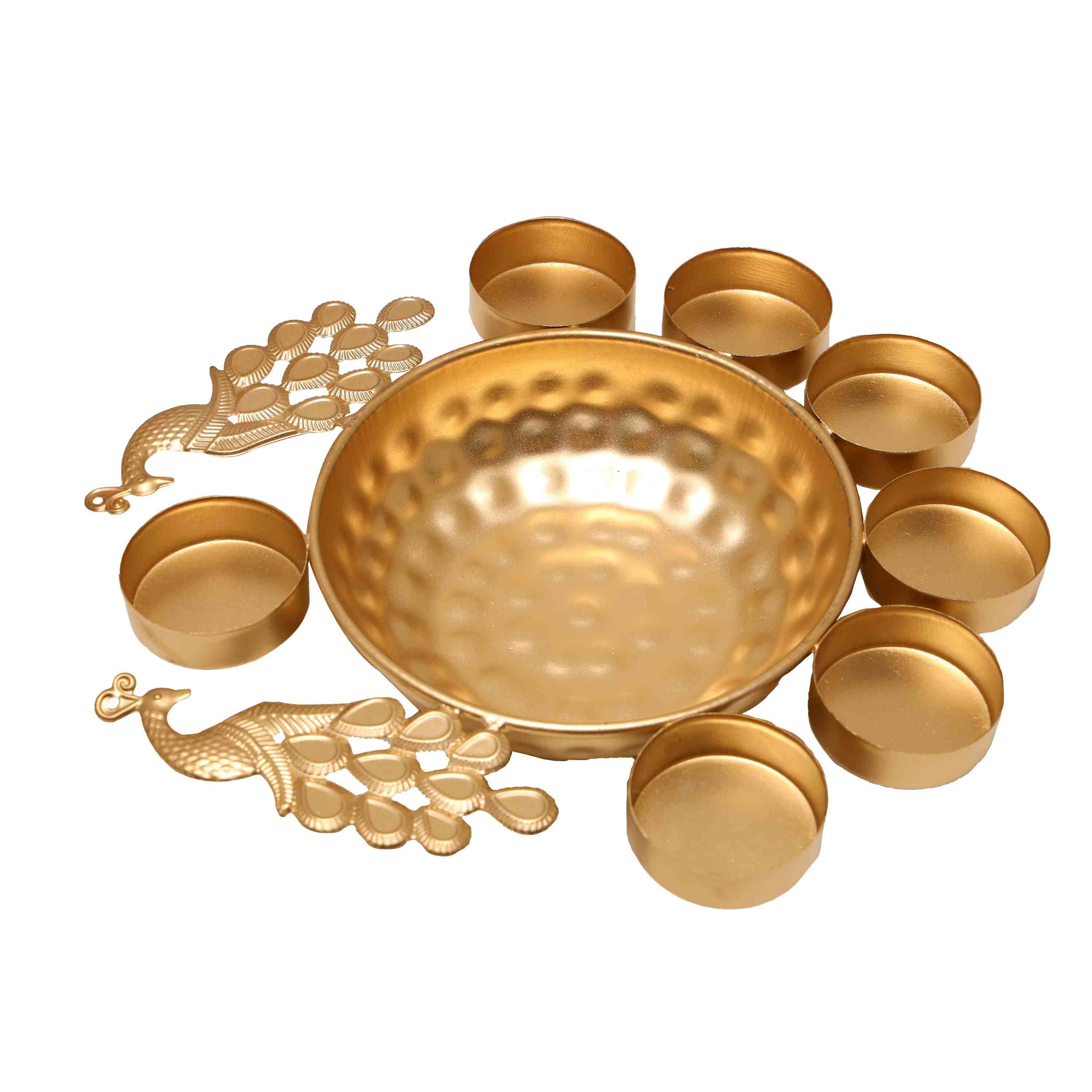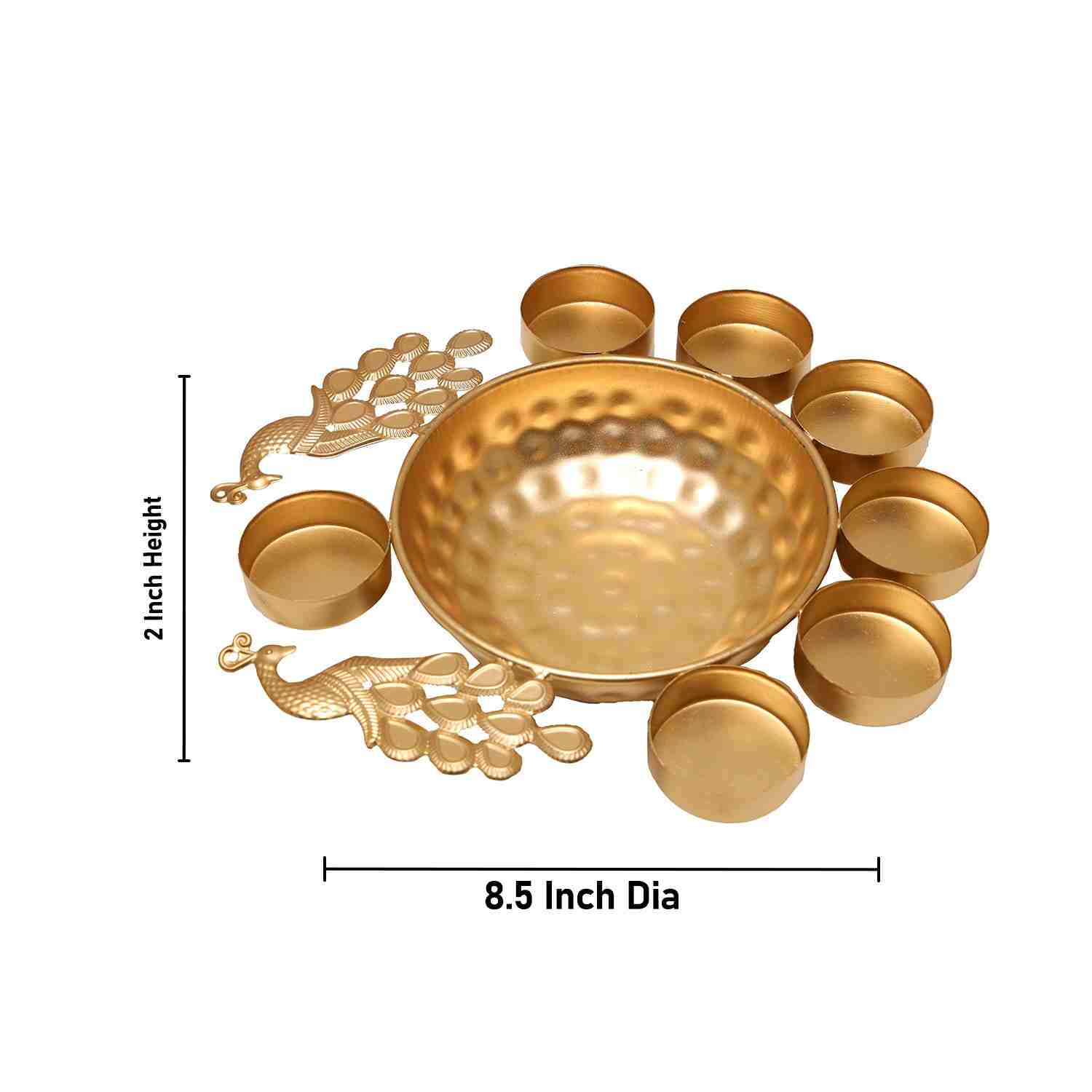 Metal Uruli - 2 x 8.5 Inches | Brass Polish Urli/ T Lite Holder & Peacock Design Flower Pot for Pooja/ 175 Gms Approx
