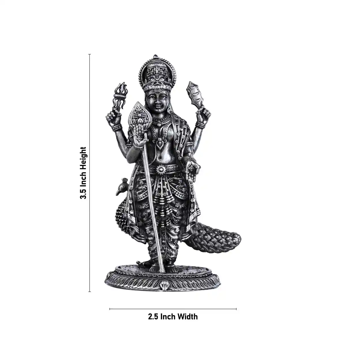 Murugan Statue With Peacock- 3.5 X 2.5 Inches | Silver Kartikeya Statue/ Antique Polish Murugan Silai For Home