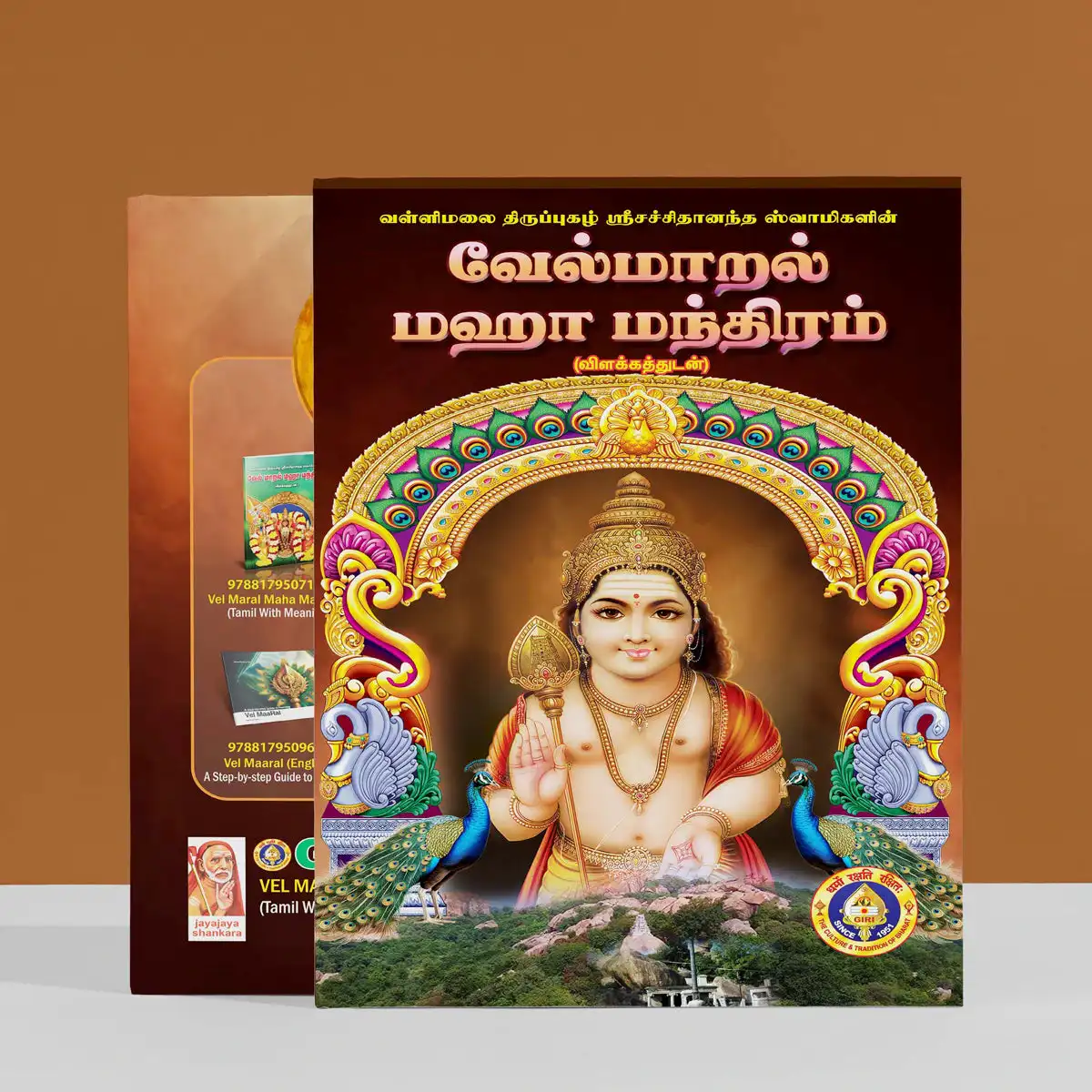 • Invoke Divine Strength and Protection The Vel Maral Maha Mantram is a revered and potent chant that is believed to bring divine protection, strength, and blessings to those who recite it with devotion. The chant invokes Lord Murugan’s divine spear (Vel), symbolizing spiritual protection, courage, and the power to overcome obstacles. This sacred mantra is traditionally recited to seek victory over enemies, both external and internal, and to invoke Lord Murugan’s grace for success, prosperity, and well-being. • Experience Spiritual Growth with Tamil and English Translations This book includes the Tamil verses of the Vel Maral Maha Mantram along with their English meanings, making it accessible to a wider audience. The Tamil verses preserve the authenticity and beauty of the chant, while the English translation ensures that the deeper meanings of the mantras are understood by those who may not be familiar with the Tamil language. This dual-language format makes it easier to connect with the spiritual essence of the mantra. • The Power of Vel: Lord Murugan’s Divine Spear The Vel, Lord Murugan's weapon, symbolizes spiritual strength and victory over all forms of evil and ignorance. It represents the power of righteousness and the ability to overcome life’s challenges. The Vel Maral Maha Mantram acts as a powerful tool for self-transformation, removing negative energies, and attracting divine protection. By chanting the mantra, devotees seek to align themselves with Lord Murugan’s energy, thereby gaining the courage to face adversities and the wisdom to navigate life’s path. • A Source of Divine Protection and Blessings Reciting the Vel Maral Maha Mantram helps in attaining Lord Murugan’s divine blessings, ensuring that His protection is always with the devotee. This mantra is believed to shield the practitioner from negative influences and bring about peace, harmony, and prosperity. Whether recited during poojas, festivals, or personal meditation, the mantra enhances the devotee’s spiritual practice and brings them closer to Lord Murugan’s divine grace. • Perfect for Pooja, Meditation, and Daily Recitation The Vel Maral Maha Mantram is often recited during special occasions, festivals, or daily worship to seek Lord Murugan’s blessings. The Tamil verses, combined with their English meaning, make it an excellent addition to your daily spiritual practice. It is perfect for use during pooja (ritual worship) or as part of your meditation sessions to create a powerful spiritual atmosphere that draws Lord Murugan’s divine energy into your home. • A Spiritual Guide for Devotees and Seekers This book is not just a guide for reciting the Vel Maral Maha Mantram; it is also a spiritual tool that helps devotees cultivate a deeper connection with Lord Murugan. The mantras encourage devotees to embrace virtue, courage, and spiritual awakening. The book can serve as a daily reminder to invoke divine energy and strength from Lord Murugan, providing a sense of comfort and protection in times of uncertainty. • A Meaningful Gift for Devotees of Lord Murugan This book is a perfect gift for anyone who seeks a deeper connection with Lord Murugan or is interested in spiritual practices that bring about personal growth, protection, and victory. Whether for a housewarming, festival, or spiritual occasion, this book serves as a meaningful and divinely inspiring gift for those who worship Lord Murugan or are beginning their spiritual journey. • A Transformative Spiritual Experience Reciting the Vel Maral Maha Mantram regularly offers transformative spiritual benefits. By immersing yourself in the sacred verses, you will experience a spiritual upliftment that enhances your mental and emotional state. The chant promotes peace of mind, strength of character, and a sense of divine protection that permeates all aspects of life. Step Into Divine Strength with Lord Murugan The Vel Maral Maha Mantram offers a powerful and divine connection with Lord Murugan. By incorporating this sacred chant into your spiritual practice, you can invoke His blessings, receive His protection, and achieve success and prosperity. This book serves as a spiritual tool for those seeking guidance, empowerment, and divine strength on their journey. Order your copy today and embrace the transformative power of Lord Murugan’s divine energy.