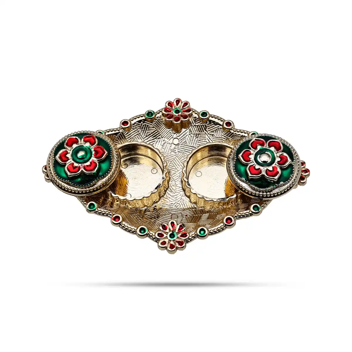 Decorated Plate with Two Chandan Cup - 1 x 6 Inches | Sindoor Plate/ Kumkum Tray/ Haldi Kumkum Plate for Home