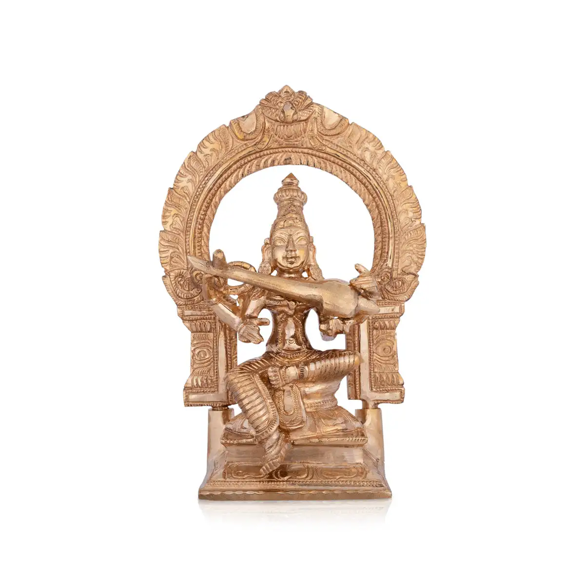 Saraswati Murti Sitting On Base With Arch - 7 x 4.5 Inches | Panchaloha Idol/ Saraswathy Idol for Pooja